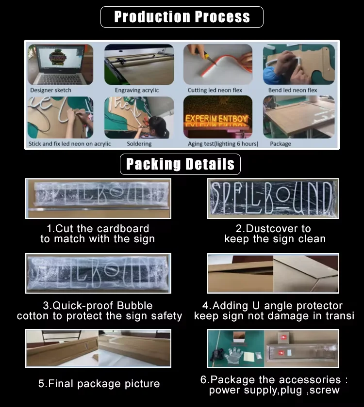 match with the sign size 4.Add Protector to stick with cardboard and make heaven and earth cover packing box 5.Put Neon sign and