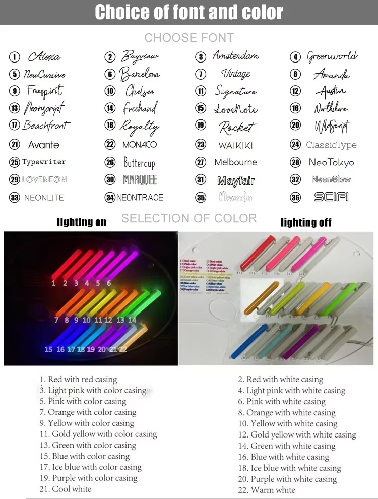 | Neon Colors | Red, Blue, Green, yellow, Orange, white, warm white, pink, baby pink,lemon yellow, ice blue |